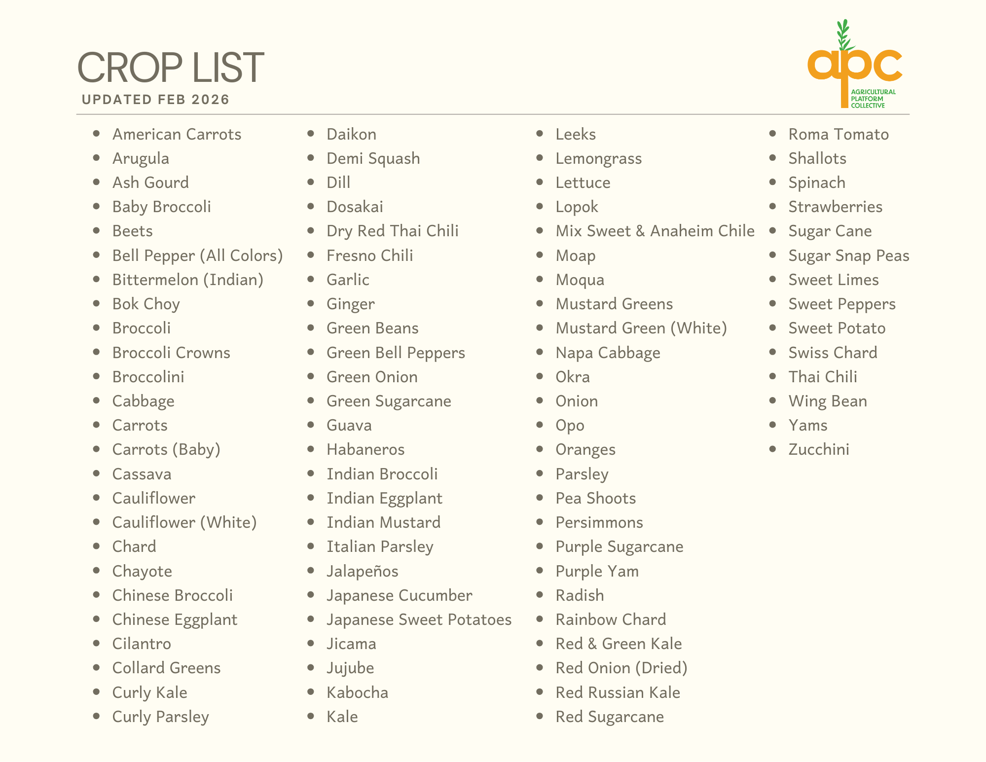 APC producers grow a wide variety of fresh, seasonal, and culturally significant crops across California. This list reflects current availability across our network of 50+ small farms.