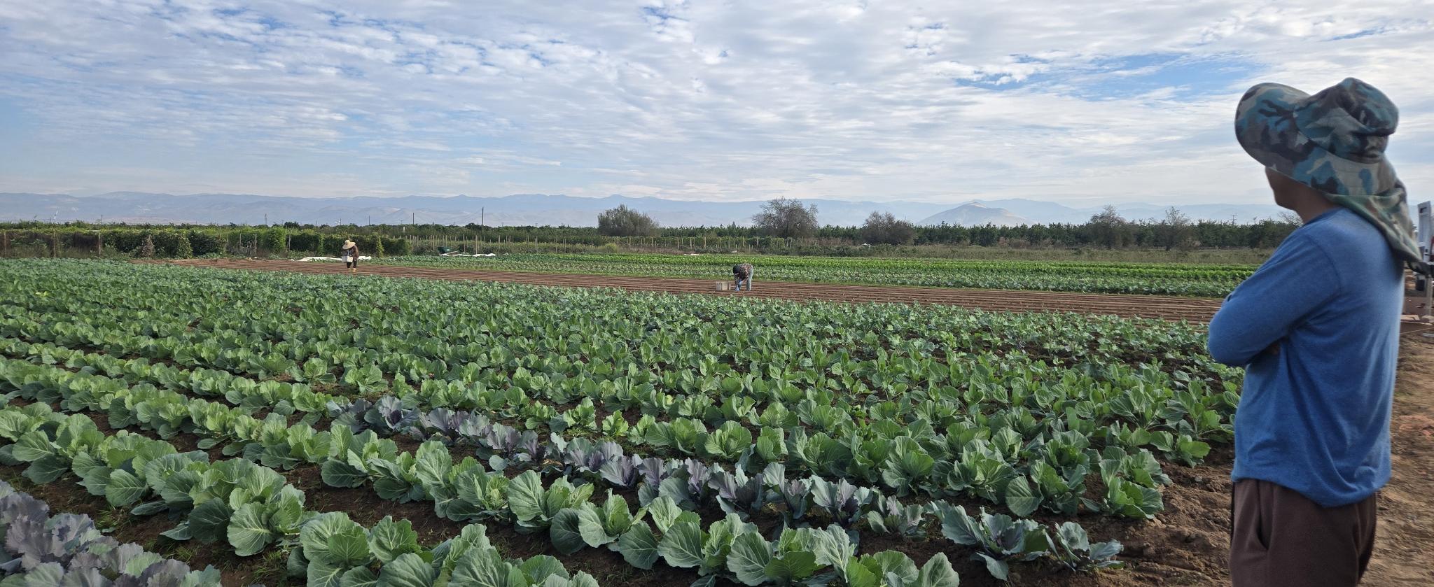 Our first stop was Gary Moua’s farm in Sanger, where Gary and his wife were in the middle of planting cauliflower and onions. Rows of leafy greens stretched across the field: cabbage, kale, and mustards thriving in the cool morning air.